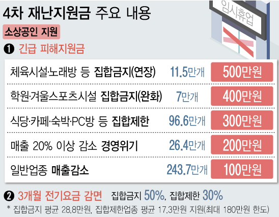 ▲노래연습장 등 집합금지(연장) 업종에는 500만원 지급